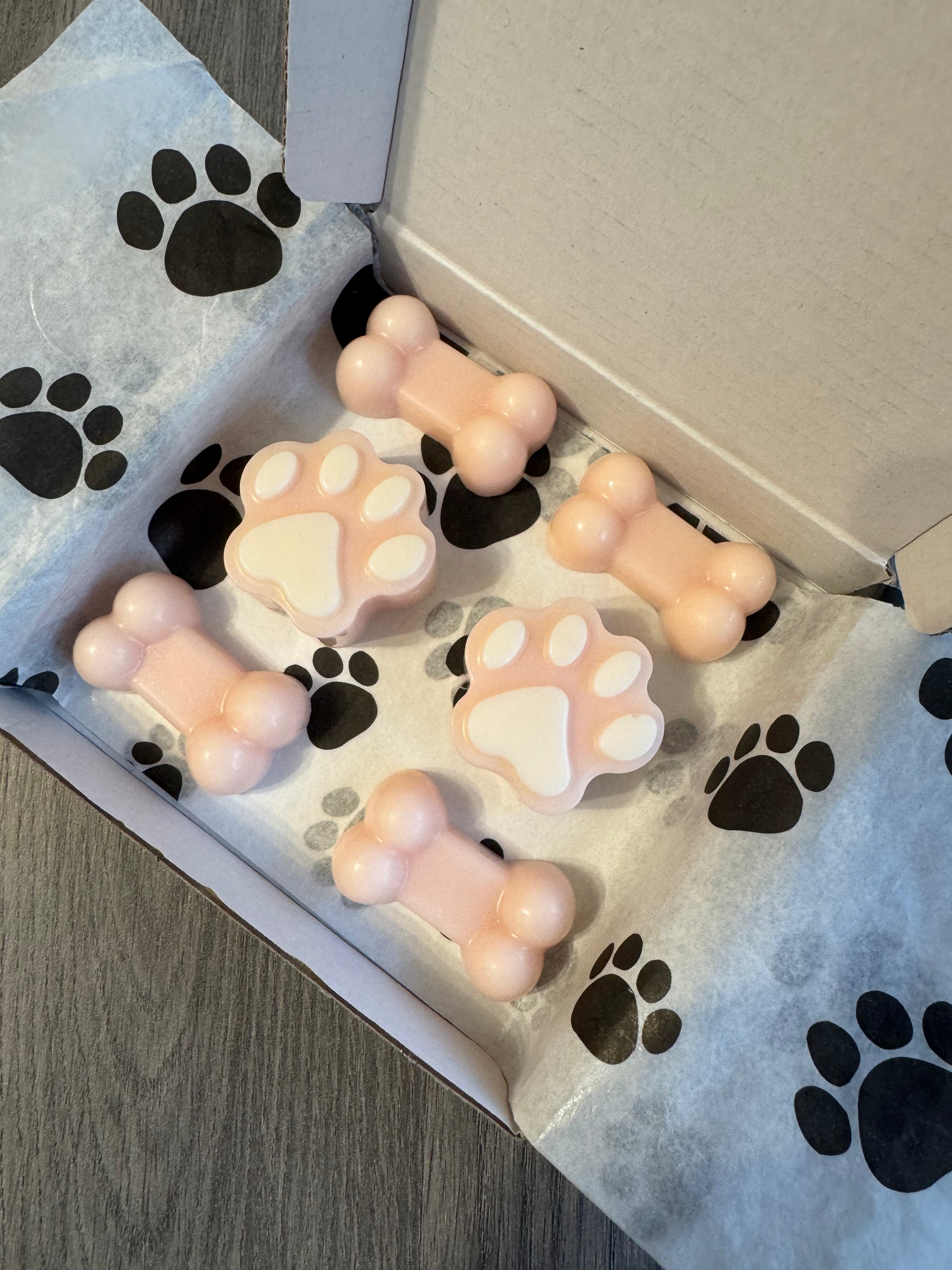 Enhance any room's ambiance with our Fur Baby Wax Melt Boxes! Each box comes with two adorable paw-shaped wax melts and two bone-shaped wax melts. Perfect as a gift or for your own indulgence. Elevate your atmosphere with these cute and impressive wax melts.
